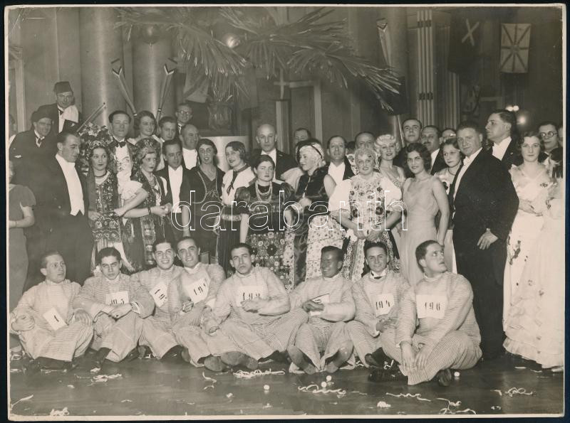 Description: cca 1935 Photo Stemmer budapesti fényképész és fotóriporter pecsétjével jelzett vintage fotó (Rabosított fiatalemberek, felettük és mögöttük a rabtartóik - farsangi bál), ezüstzselatinos fotópapíron, sarkán törésvonal, 17,8x23,7 cm