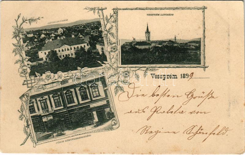 1899 (Vorläufer) Veszprém, Pósch könyvkereskedés, Dávid árvaház, látkép. Art Nouveau, floral (EK)