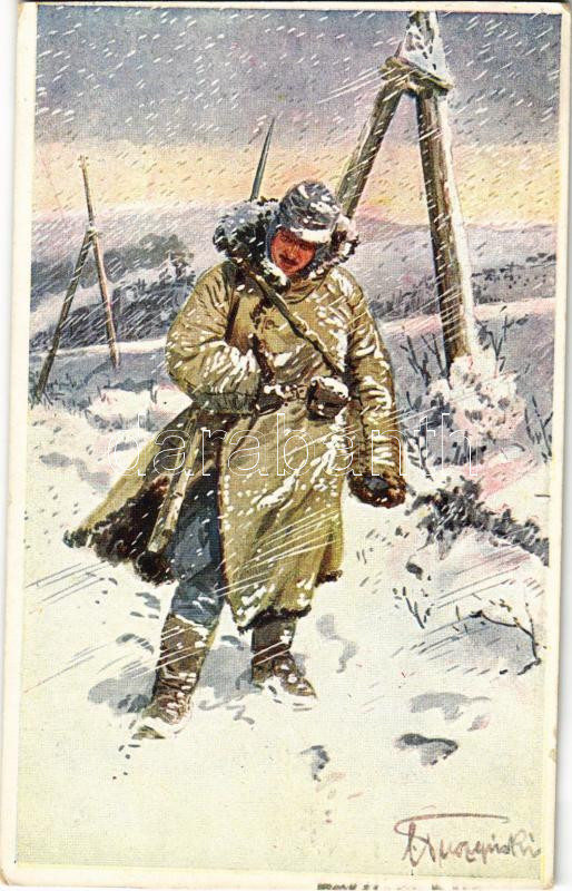 Description: 1916 Offizielle Postkarte zu gunsten der Hilfsaktion "Kälteschutz" Nr. 392. K.H.B. / WWI Austro-Hungarian K.u.K. military art postcard, soldier in the snowstorm s: Tuszynski (EK)
