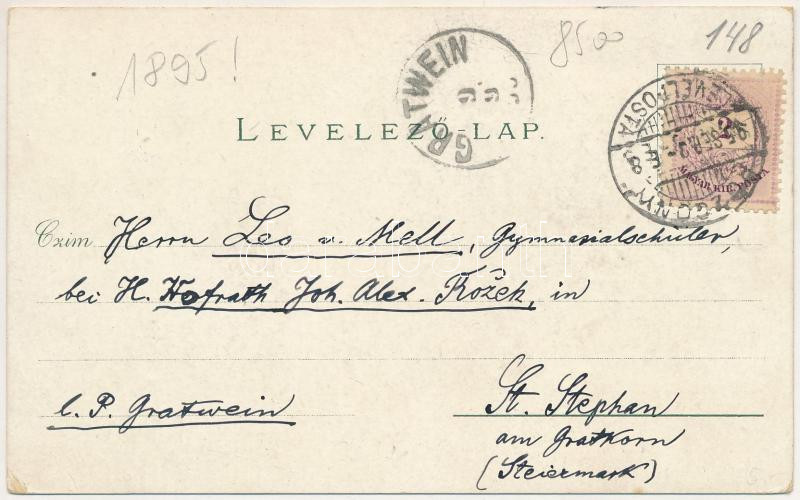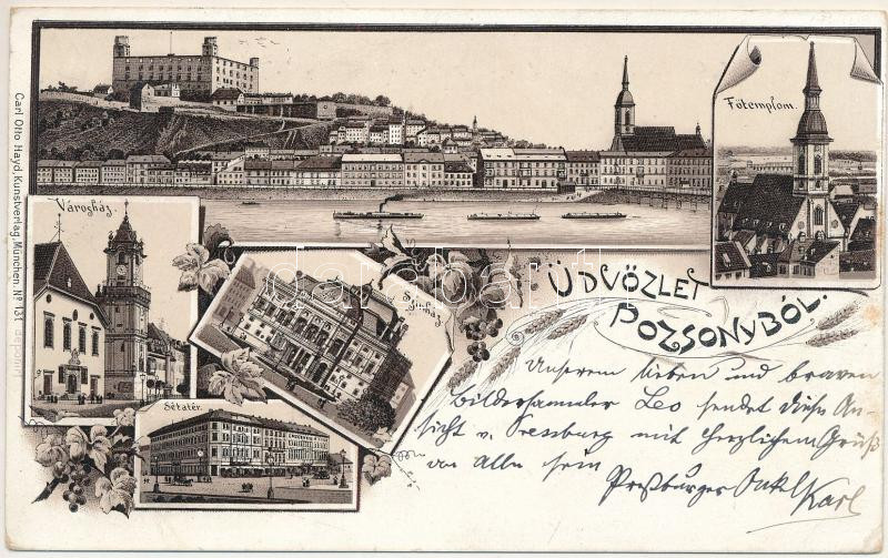 1895 (Vorläufer!) Pozsony, Pressburg, Bratislava; Főtemplom, Városház, Sétatér, Színház / church, town hall, promenade, theatre. Carl Otto Hayd's Art Nouveau, floral, litho (EK)