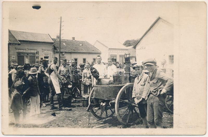 1927 Szobránc, Sobrance; Fő utca, katonák tábori mozgókonyhánál ételos... https://www.darabanth.com/en/460-Online-auction/460.0/Postcards/Slovakia~1500007/1927-Szobranc-Sobrance-Fo-utca-katonak-tabori-mozgokonyhanal-etelosztaskor-hatterben-Frantisek~II3083899