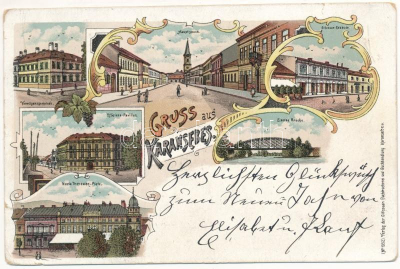 1898 (Vorläufer) Karánsebes, Caransebes; Vermögensgemeinde, Officiers-Pavillon, Hauptgasse, Diöcesan-Gebäude, Eiserne Brücke, Maria Theresien-Platz / Tiszti pavilon, Fő utca, Egyházmegye épülete, Vashíd, Mária Terézia tér / officers' pavilion, main street, diocesan building, iron bridge, square. Art Nouveau, floral, litho (kis szakadás / small tear)