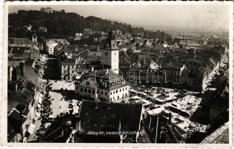 1942 Brassó, Kronstadt, Brasov; Városháza, piac, H. Zeidner, Viktor Butyka, Tellmann és Wilh. Hiemesch üzlete, gyógyszertár, Fonciere biztosító / town hall, market, shops, pharmacy. photo