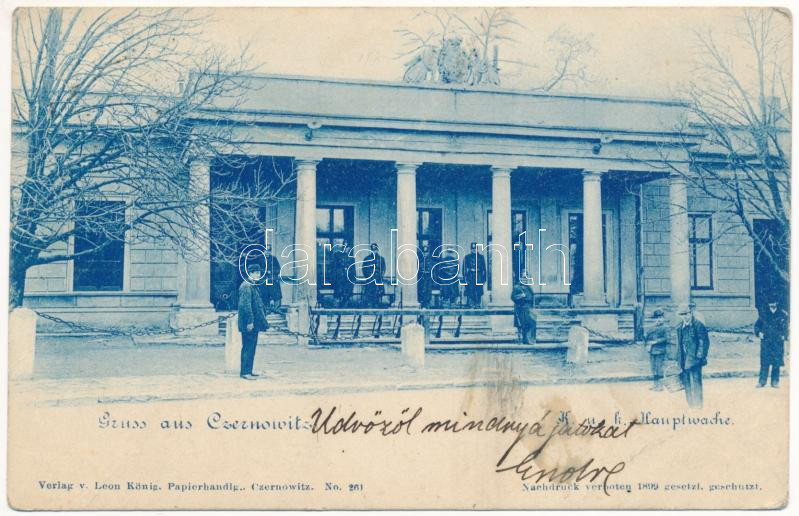 Description: 1900 Chernivtsi, Czernowitz, Cernauti, Csernyivci (Bukovina, Bukowina); K.u.K. Hauptwache / Austro-Hungarian military, main guard. Verlag v. Leon König (fa)