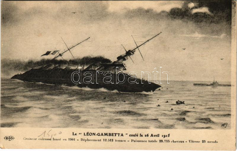 Le "Léon Gambetta" coulé le 26 Avril 1915 / Osztrák-magyar (K.u.k. Kri... https://www.darabanth.com/en/460-Online-auction/460.0/Postcards/Warships~1500034/Le-Leon-Gambetta-coule-le-26-Avril-1915-Osztrak-magyar-Kuk-Kriegsmarine-tengeralattjaro~II3076354