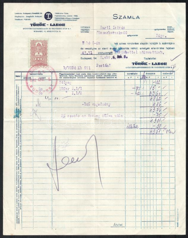 https://www.darabanth.com/en/461-Online-auction/461.0/Art-and-other-collectibles/Documents~1500020/1942-Torok-Labor-Gyogyarunagykereskedes-es-Vegyeszeti-Gyar-RT-fejleces-szamla-Hofer-sz~II3093958