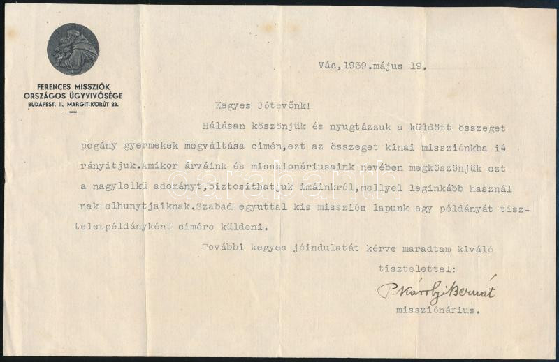 Description: 1939 P. Károlyi Bernát, szül. Krausz Ádám (1892-1954) ferences szerzetes, a Demokrata Néppárt országgyűlési képviselőjének autográf aláírása, kínai ferences misszió javára küldött adományt megköszönő levelén