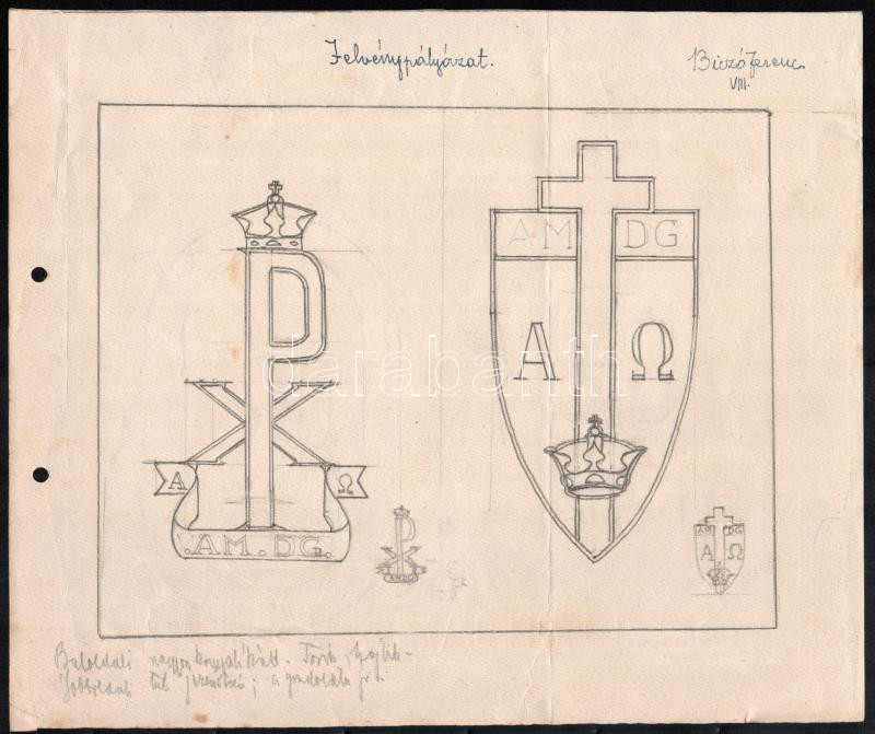 cca 1930-1940 Biczó Ferenc diák pályázati terve a kalocsai érsekség jelvénypályázatára, ceruzás, hajtott, 25x30 cm