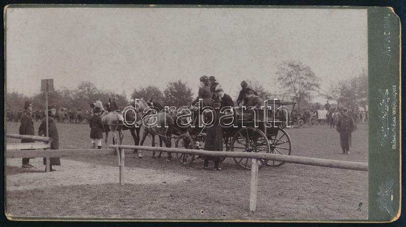 cca 1910 Lovasfogat hölgyekkel, katonákkal, hátoldalon részletesen feliratozott, nevekkel (Elmanrer Rudolf tüzérfőhadnagy, Gyurkai Liptay György huszár főhadnagy, Gutzjahr Mihály földbirtokos, stb.) keményhátú fotó Kossak József aradi műterméből, 9,5×175 cm