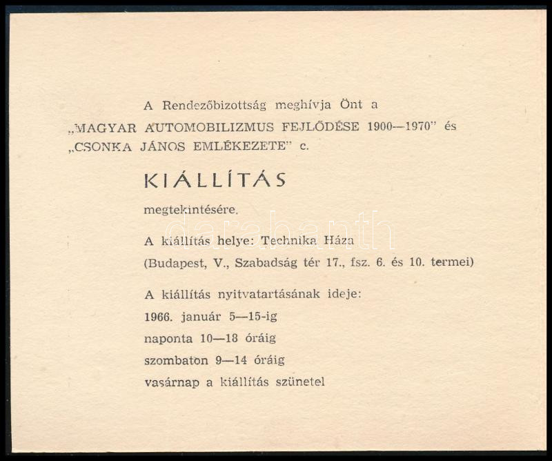 1966 Meghívó a "Magyar automobilizmus fejlődése 1900-1970" és "Csonka János emlékezete" című kiállításra