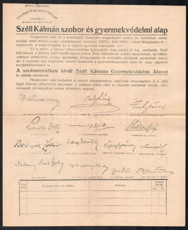 cca 1916 Zsófia Országos Gyermekszanatórium Egyesület kitöltetlen gyűjtÅ‘Ãve, Széll Kálmán szobor és gyermekvédelmi alap létrehozására folytatott adománygyűjtésrÅ‘l, nyomtatott aláÃrásokkal