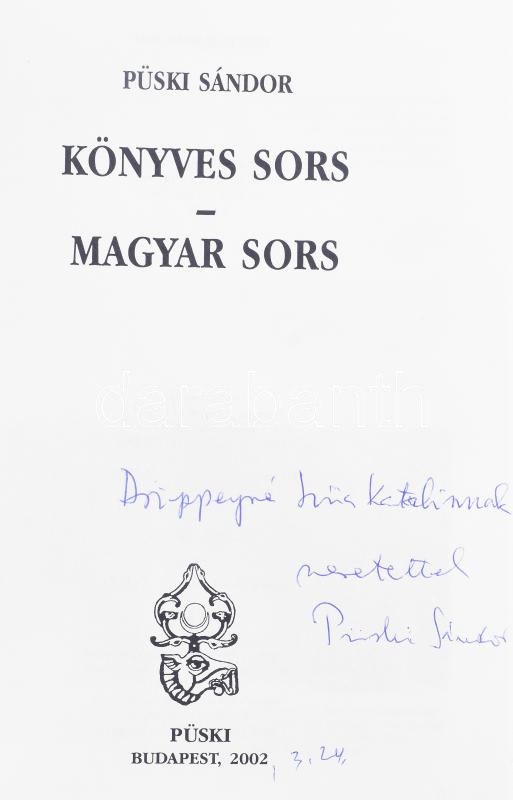Püski Sándor: Könyves sors - magyar sors. A szerző, Püski Sándor (1911... https://www.darabanth.com/en/461-Online-auction/461.0/Books/Books-Other-rarities~2000044/Puski-Sandor-Konyves-sors-magyar-sors-A-szerzo-Puski-Sandor-1911-2009-konyvkiado-altal~II3089297