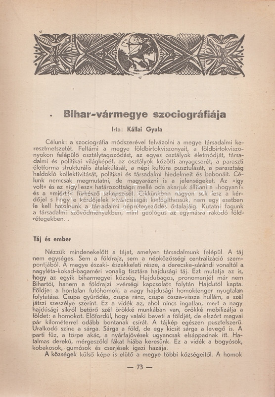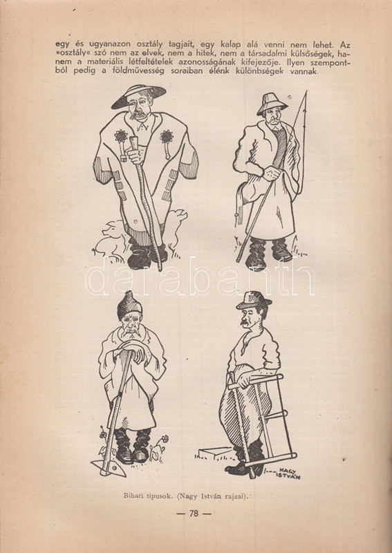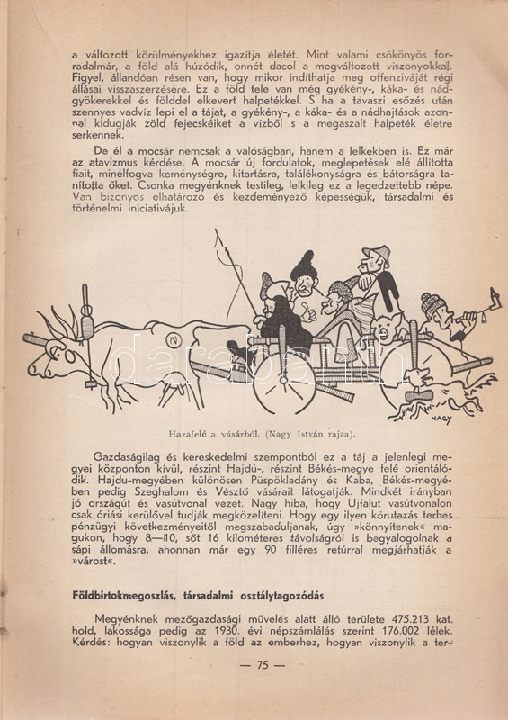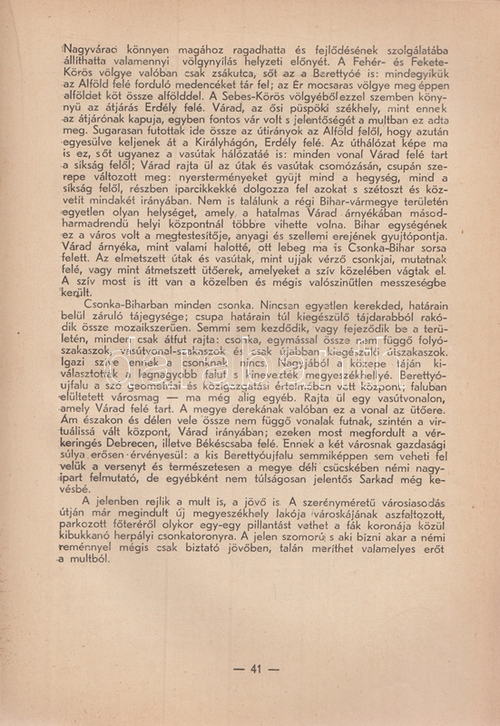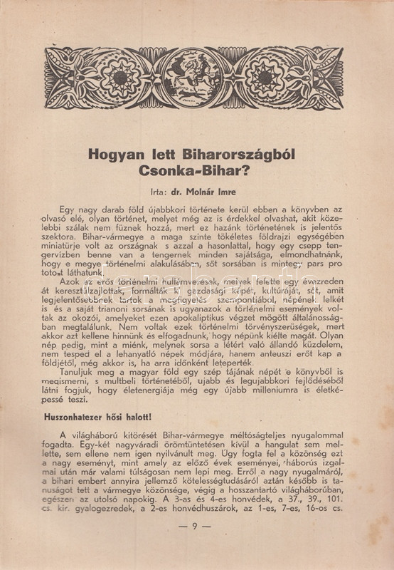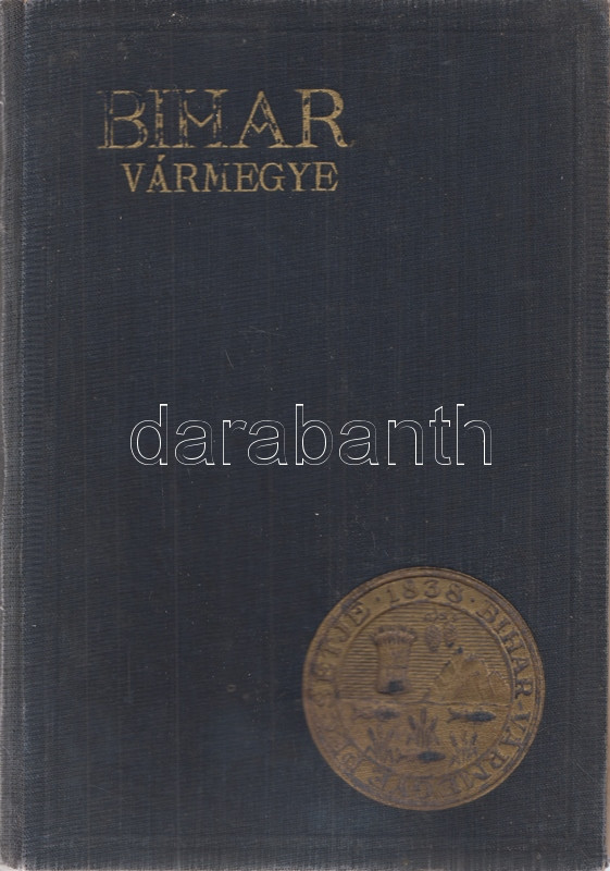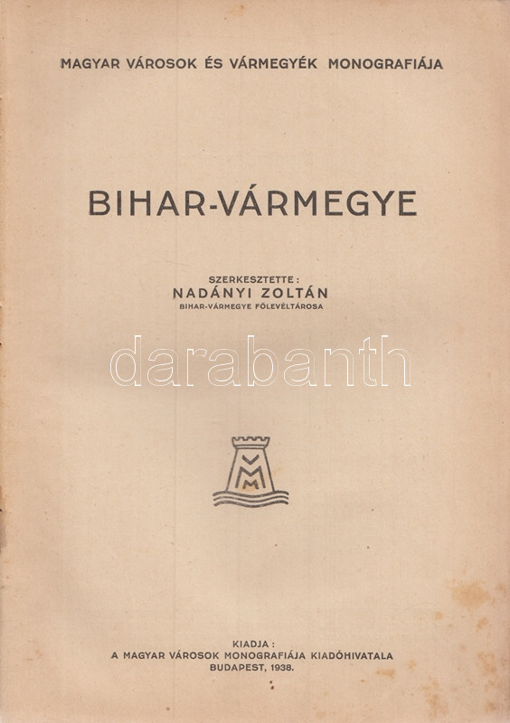Nadányi Zoltán (szerk.): Bihar-vármegye. Budapest, 1938. Magyar Városok Monografiája Kiadóhivatala (Sárik Gyula és Géza ny., Budapest-Cegléd). 519 + [1] + 167 + [1] p. + 5 t. (kétoldalas). A trianoni döntéssel kettészakított Bihar vármegye helytörténeti, statisztikai, gazdaságföldrajzi, néprajzi, szociográfiai monográfiája, oldalszámozáson belül Nagy István karikatúráival, Bély János szövegközti rajzaival, egész oldalas és szövegközti térképvázlatokkal. Jóllehet a kötet igen erősen hangsúlyozza a megyeszékhelytől, Nagyváradtól való elszakítás gazdaságilag és kulturálisan egyaránt megrendítő hatását, ám egyúttal számos passzust szentel a bihari nép életrevalóságának ecsetelésére. A monográfia szövege után újrakezdődő oldalszámozással az adatközlők társadalomtörténeti szempontból is tanulságos adattára. Példányunk előzékein és számos oldalon halvány foltosság, kötetünk fűzése enyhén meglazult. (Magyar városok és vármegyék monografiája XXV. kötet.) BOEH VII 5565. Aranyozott, vaknyomásos, enyhén foltos kiadói egészvászon kötésben, az első kötéstáblán Bihar vármegye aranyozott, dombornyomású címerrajzával.
