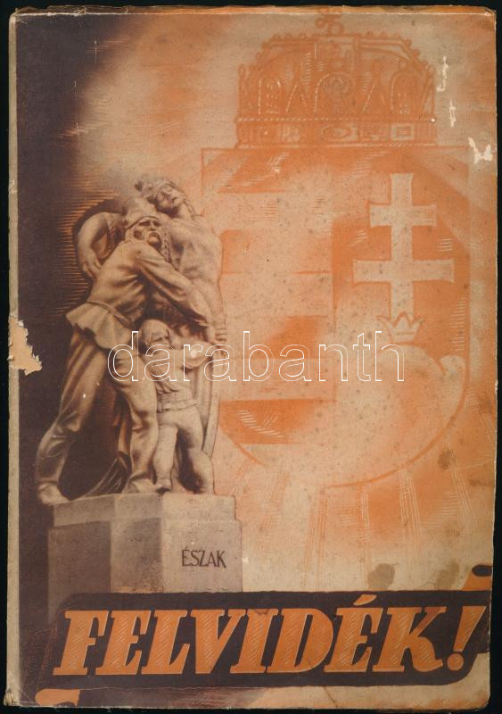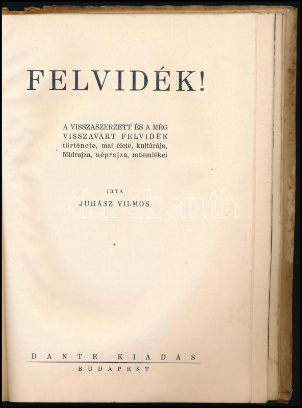 Juhász Vilmos: Felvidék! A visszaszerzett és a még visszavárt Felvidék története, mai élete, kultúrája, földrajza, néprajza, műemlékei. Bp., [1939], Dante, 49+(1) p.+ 4 (kétoldalas, fekete-fehér képek) t.+ 4 (kihajtható) t.+ 2 (kihajtható térképek) t. Kiadói illusztrált papírkötés, kissé viseltes, sérült, foltos borítóval, helyenként foltos lapokkal, az egyik kihajtható térkép kissé szakadt.