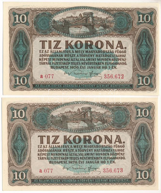 1920. 10K (2x) sorszámkövetők "a 077 356.672 - a 077 356.673" T:UNC,AU...