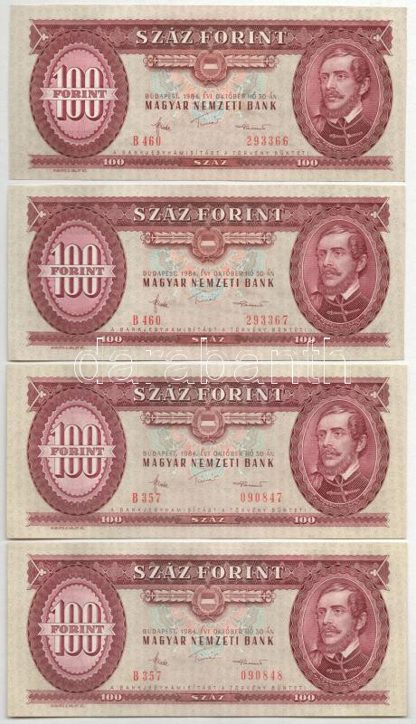https://www.darabanth.com/en/461-Online-auction/461.0/Numismatics/Hungarian-Banknotes~500009/1984-100Ft-4x-paronkent-sorszamkovetok-T-AU-XF-Adamo-F35~II3093443