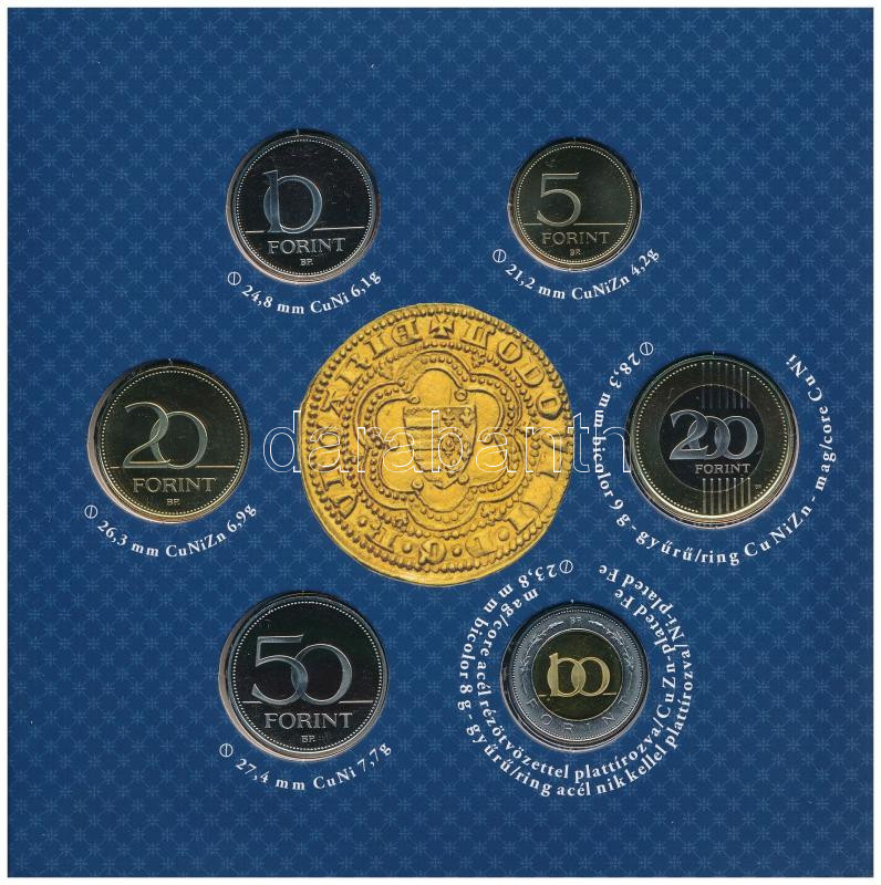 2013. 5Ft-200Ft (6xklf) forgalmi sor szettben + 2013. "I. Lajos aranyforintja" aranyozott Ag, jelzett utánveret (3,49g/0.999/20mm) T:PP belső tokon a ragasztás elengedett