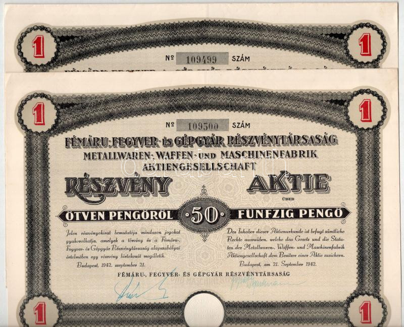 Description: Budapest 1935-1942. "Fémáru-, Fegyver és Gépgyár Részvénytársaság" részvénye 50P-ről német és magyar nyelven, szelvényekkel, bélyegzéssel és szárazpecséttel (3x, közte sorszámkövető pár) T:AU,XF