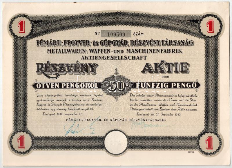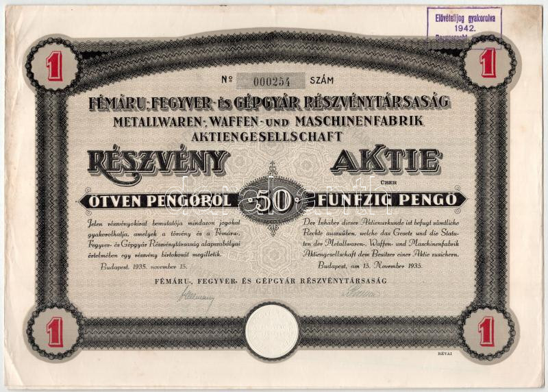Budapest 1935-1942. "Fémáru-, Fegyver és Gépgyár Részvénytársaság" rés... https://www.darabanth.com/en/461-Online-auction/461.0/Numismatics/Shares-and-Tickets~500007/Budapest-1935-1942-Femaru-Fegyver-es-Gepgyar-Reszvenytarsasag-reszvenye-50P-rol-nemet-es~II3094500