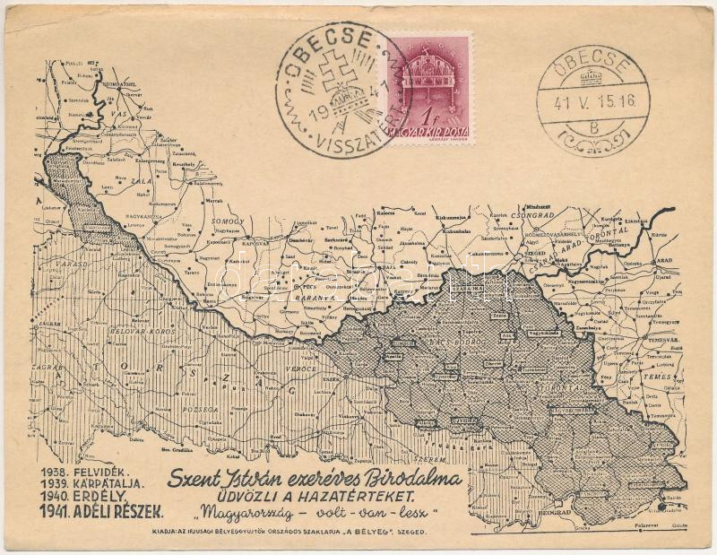 Description: Szent István ezeréves Birodalma üdvözli a hazatérteket. Felvidék, Kárpátalja, Erdély, Déli részek. Magyarország volt-van-lesz. Kiadja az Ifjúsági Bélyeggyűjtők Országos Szaklapja "A Bélyeg"; Visszacsatolt déli területek térképe / Hungarian irredenta, map of the reannexed territories + "1941 Óbecse visszatért" So. Stpl. (EK)