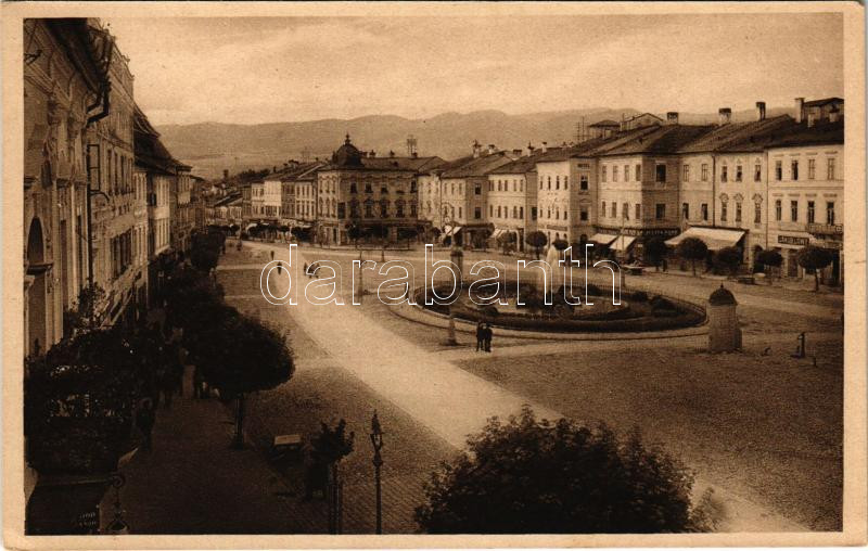 Description: Besztercebánya, Banská Bystrica; Hlavné namestie / Fő tér, Jakub Löwy, Julius Papp üzlete, szálloda, szökőkút / main square, shops, hotel, fountain (EM)