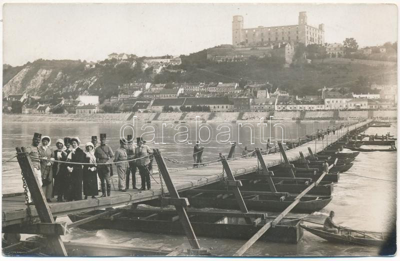 Pozsony, Pressburg, Bratislava; Brückenschlag / vár, pontonhíd (hajóhíd) építése / castle, K.u.K. soldiers building the pontoon bridge. photo