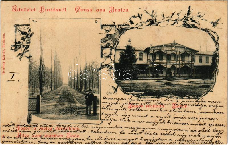 1900 Buziás, Fasor a meleg fürdőhöz, Bazár szálloda. Herrling Károly k...