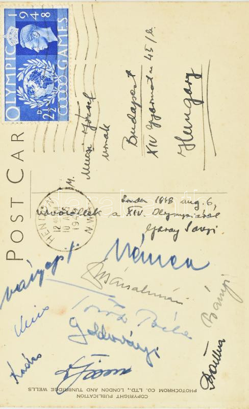 1948 Londoni olimpia magyar sportolók által aláírt képeslap: Várszegi József, Garay Sándor, Német Imre, Bácsalmási Péter, Kádas Géza, Klics Ferenc, Goldoványi Béka, Csányi György, Brtha László, atléták, úszók, futók.