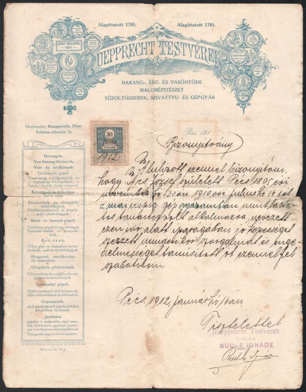 1912 Pécs, Ruepprecht Testvérek harang-, érc és vasöntöde, malomépítészet, tűzoltószerek, szivattyú- és gépgyár fejléces munkáltatói igazolás (bizonyítvány), Rudle Ignácz aláírással, 30f okmánybélyeggel. Kissé sérült, foltos.