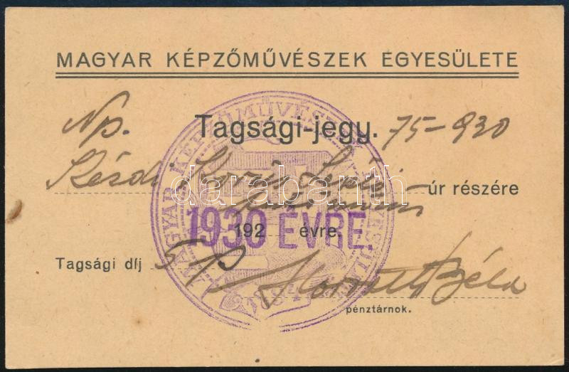 1930 Magyar Képzőművészek Egyesülete tagsági jegy, Kézdi-Kovács László...