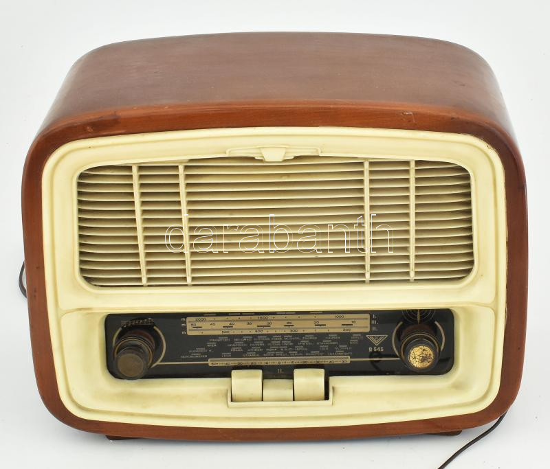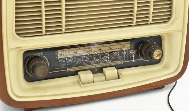 Vadásztölténygyár - R545 Jubilate rádió. 1955, jó állapotban, 34x25x16 cm. /// Hat hangoltkörös, három hullámsávos (R-K-H), 4+1 csöves, váltóáramú hálózati (R 545), illetve 4 csöves (R 545B), kis fogyasztású, telepes középszuper készülékek fényezett fakávában, bakelit előlappal, nyomógombos hullámváltóval és rövidhullámon sávnyújtóval. Ezzel a modellel kezdte a meg a rádiógyártást a Vadásztölténygyár 1955-ben.