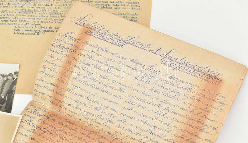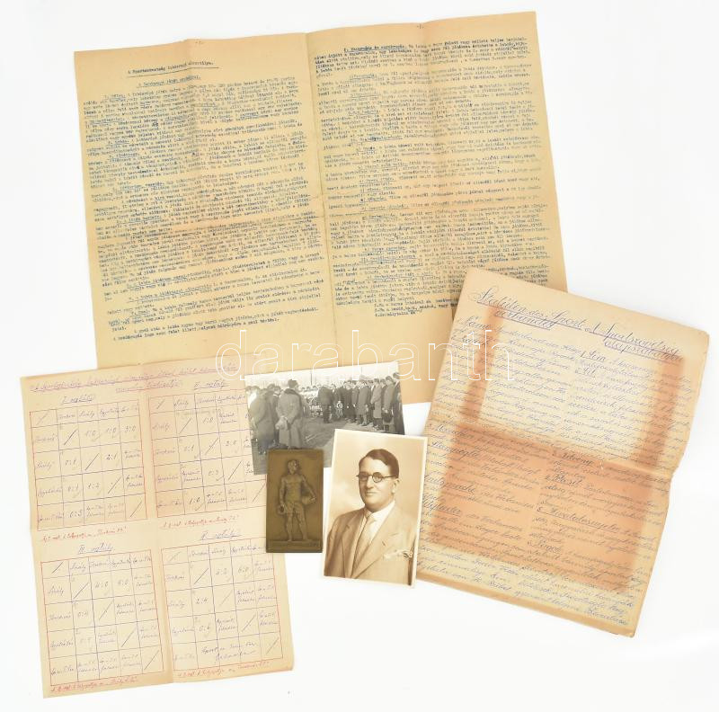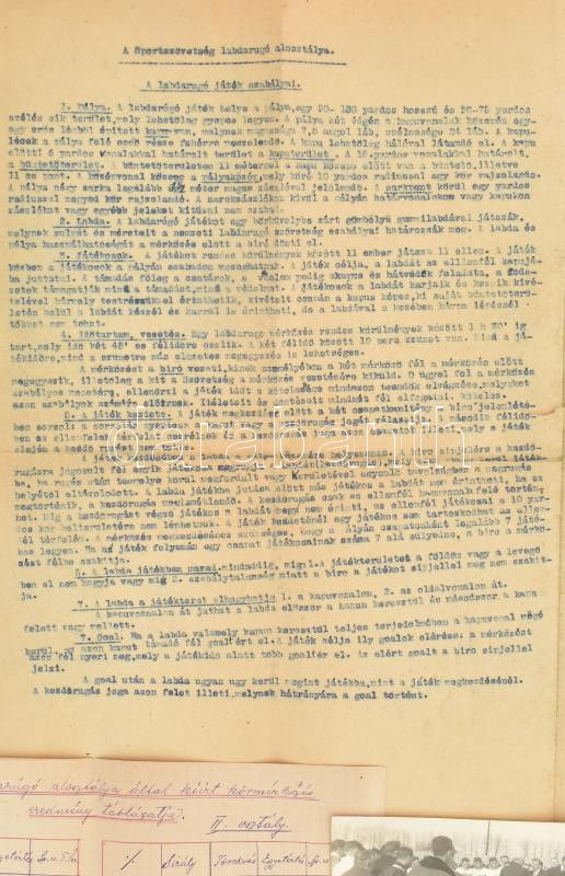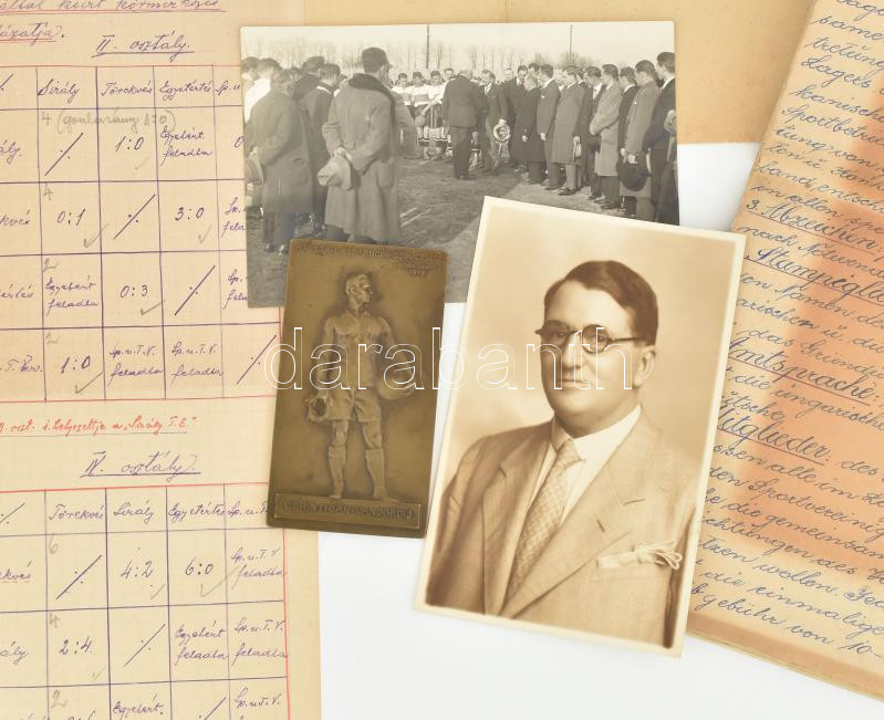 1919 Stobbe Kálmán (1883-1936) építőmester, labdarúgó, a magyar válogatott edzője football hagyaték tétele:a Pervaja Recskai hadifogoly táborban szervezett sportszövetség illetve az ezen belül szervezett labdarúgó alosztály alapszabályai magyar és német nyelven, játszó játékosok felsorolása, egy fotó, labdarúgó játék szabályai. valamint egy névre szóló vándordíj plakettje: Istók János (1873-1972) 1909. "Magyar Labdarúgók Szövetsége - Corinthián Vándordíj" egyoldalas bronz plakett, hátoldalán gravírozva "1907/08 év Stobbe Kálmán". (91x50mm) T:EF / 1919 Kálmán Stobbe (1883-1936) builder, footballer, coach of the Hungarian national team football legacy item: the basic rules of the sports association organized in the Pervaja Recskai POW camp and the football sub-division organized within it in Hungarian and German, list of playing players, a photo, football game rules . as well as a plaque for a named wanderer's award: