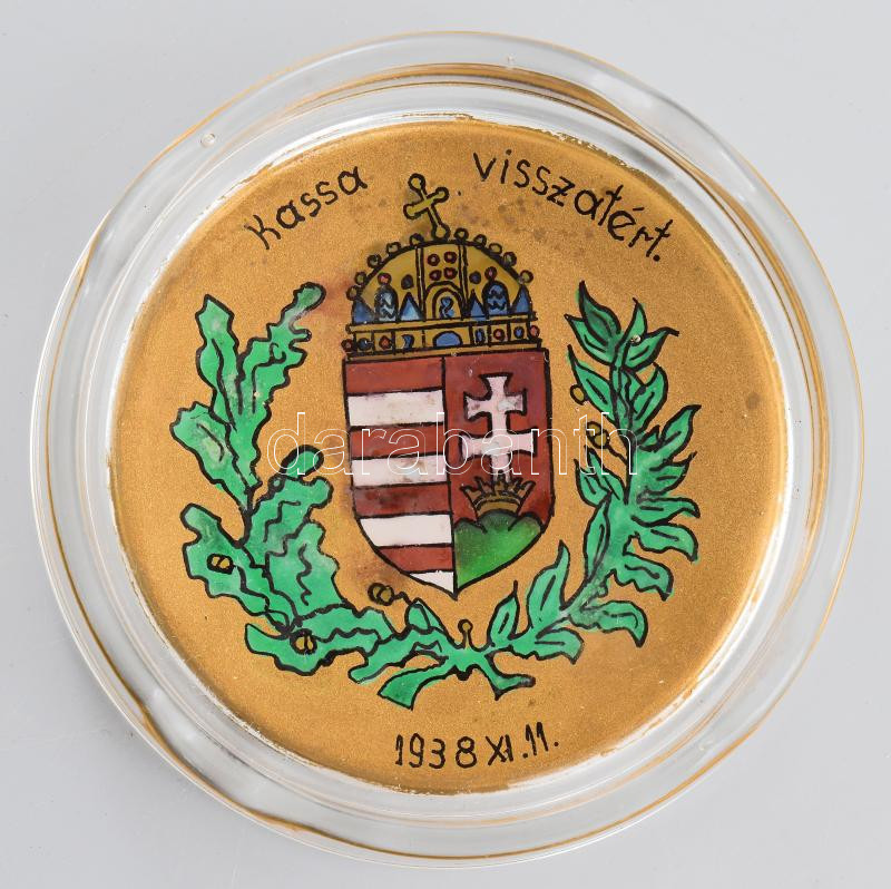 https://www.darabanth.com/en/462-Online-auction/462.0/Art-and-other-collectibles/Historical-documents-manuscripts~500021/1938-Kassa-visszatert-feliratu-festett-uveg-hamutal-Aljan-festett-kopassal-d-9-5-cm~II3100939