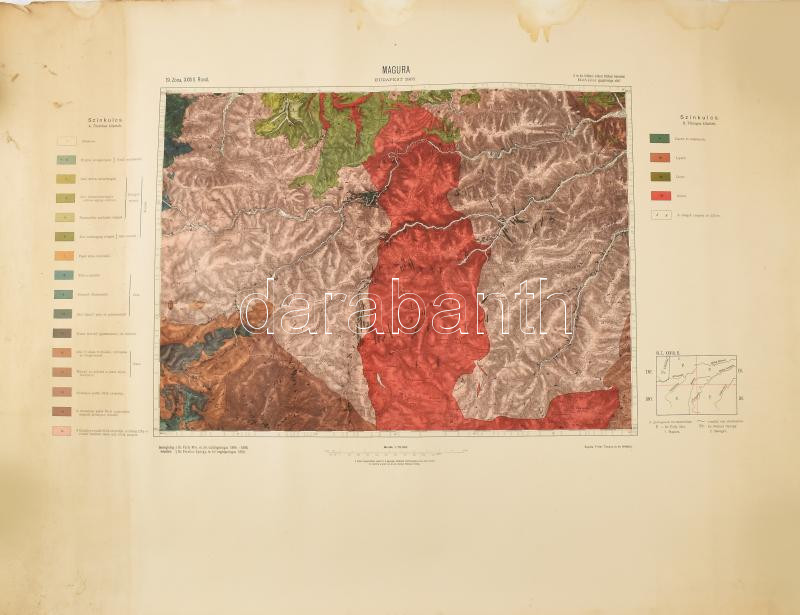 Description: Magura környékének földtani térképe 25. Zóna XXVI. Rovat, Geológiai térkép. Rjz. Gabrovitz Camillo; Litográfia. Méretarány, M. 1:75 000. Megjelent Magyarázatok a Magyar Korona országainak részletes geológiai térképéhez.Bp., 1905. 68x90 cm Kis beszakadással