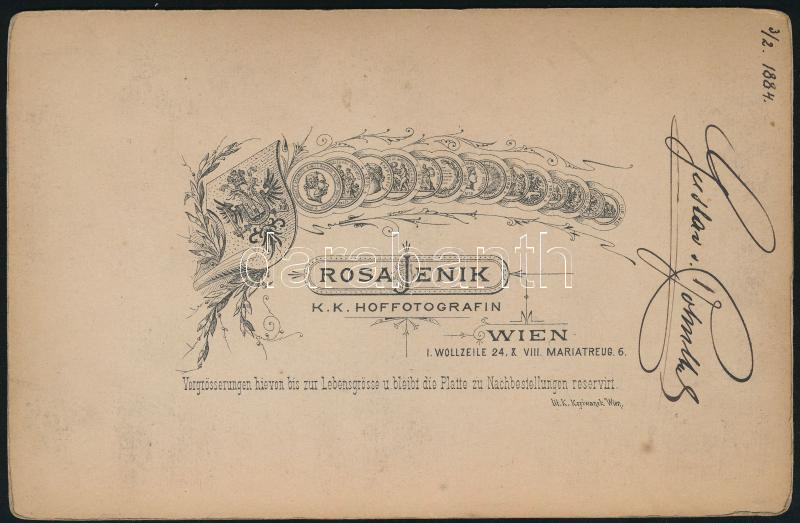 1884 Kitüntetett katona aláírt fotója, keményhátú kabinetfotó Rosa Jenik bécsi műterméből, 17x11 cm