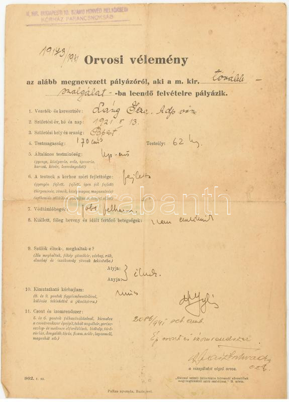 1941 M. bir. budapesti 10. sz. honvéd helyőrségi kórház parancsnokság,...