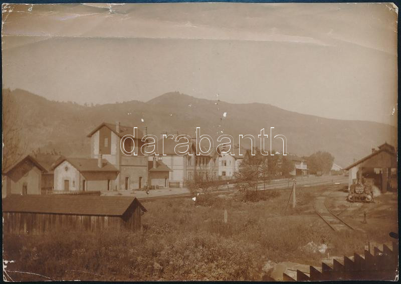 cca 1900 Petrozsény, épületek, mozdony, papírkép, szakadással, törésnyomokkal, 12×17 cm / Petrosani, Romania, photo with faults