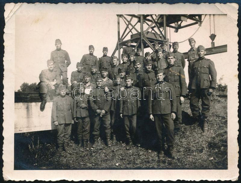 cca 1940 Magyar katonák csoportképe, a háttérben daruval. Fotó, sarokt...