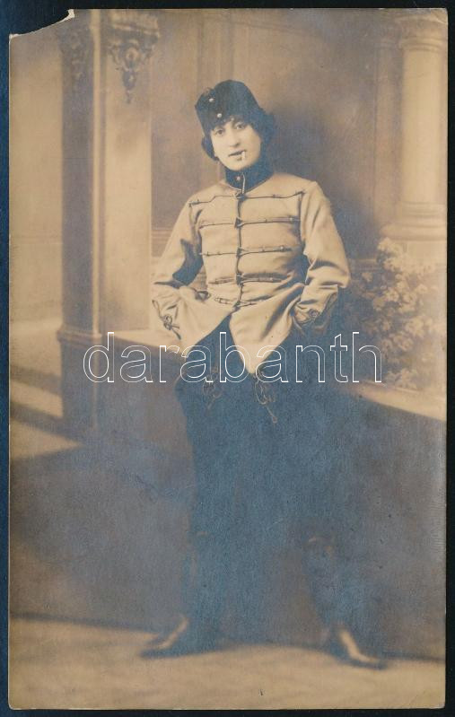 cca 1920 Hölgy (Marosi Nusi) katonaruhában, fotólap Erdős Sándor budapesti műterméből, kisebb sarokhiánnyal, 14x8,5 cm
