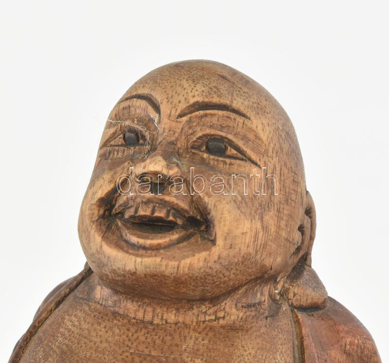Nevető Buddha. Faragott fa, kis kopással, m: 14,5 cm