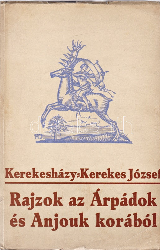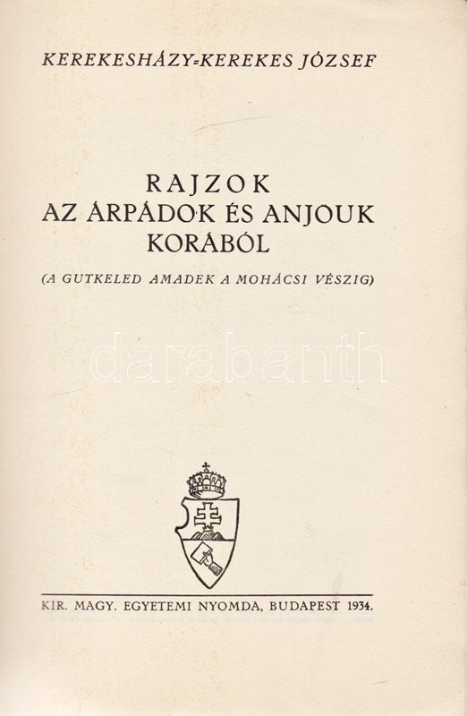 Kerekesházy-Kerekes József: Rajzok az Árpádok és Anjouk korából. (A Gutkeled Amadék a mohácsi vészig.) Budapest, 1934. Kir. Magy. Egyetemi Nyomda. 125 + [1] p. Egyetlen kiadás. Részlet az előszóból: ,,El szeretném vinni az olvasót azokba a régi időkbe, amikor a magyar urak még nyomott, lukastetejű kőházakban laktak. A szobák közepén nyílt tűzhelyek égtek, ahonnan sűrű füst gomolygott ki a vaddal-bozóttal dús, lakatlan magyar tájak fölé. Gyöngynek, Virágnak hívták akkor még a magyar asszonyokat és Székesfehérváron korozáták Magyarország királyait. Szeretném aztán visszaidézni a magyar múlt hőskorát, a lovagkort, amikor páncélos magyarok verekedtek a nápolyi dombokon, vissza, egész addig, ameddig 1526 augusztus 29-én, Pécstől nem messze, a Duna partján sokezer magyar vitéz mozdulatlan holttestére tűzött le a forró, verőfényes déli nap. Szeretném ezeknek a koroknak a levegőjét, a hátterét az egyes szereplők életviszonyain, karrierjén és gyakran: bukásán keresztül ismertetni - hiszen a történelmet, amelynek százados légköre ilyen kis mozaikokból tevődik össze, igazán csak úgy lehet megismerni, ha a részleteibe is belehatolunk." A szerző a Gutkeled-Amadé család történetén keresztül mutatja be sajátos, életmódtörténeti részletekkel dúsított történelmi vízióját az intrikákkal és konfliktusokkal terhelt magyar középkorról, oldalszámozáson belül gazdag szövegközti illusztrációs anyaggal. A kötetben oldalszámozáson belül 14 tábla, 10 nemzetségtábla, ebből egy dupla oldalas, öt kihajtható. Fűzve, színes, illusztrált, enyhén gyűrött kiadói borítóban. Körülvágatlan, jó példány.