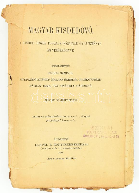Magyar kisdedóvó. A kisded összes foglalkozásának gyűjteménye és vezérkönyve. Szerk.: Peres Sándor, Stepanko Albert, Halász Sarolta, Hankovitsné Fábián Irma, Özv. Székely Gáborné. Bp., 1908., Lampel R. (Wodianer F. és Fiai.) Kiadói papírkötés, sérült borítóval, a könyvtest elvált a borítótól, és a könyvtest szétvált.