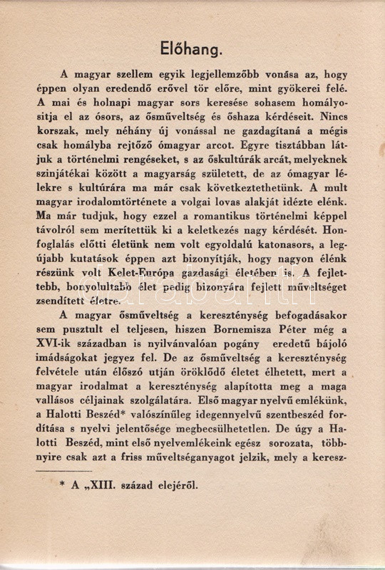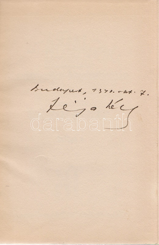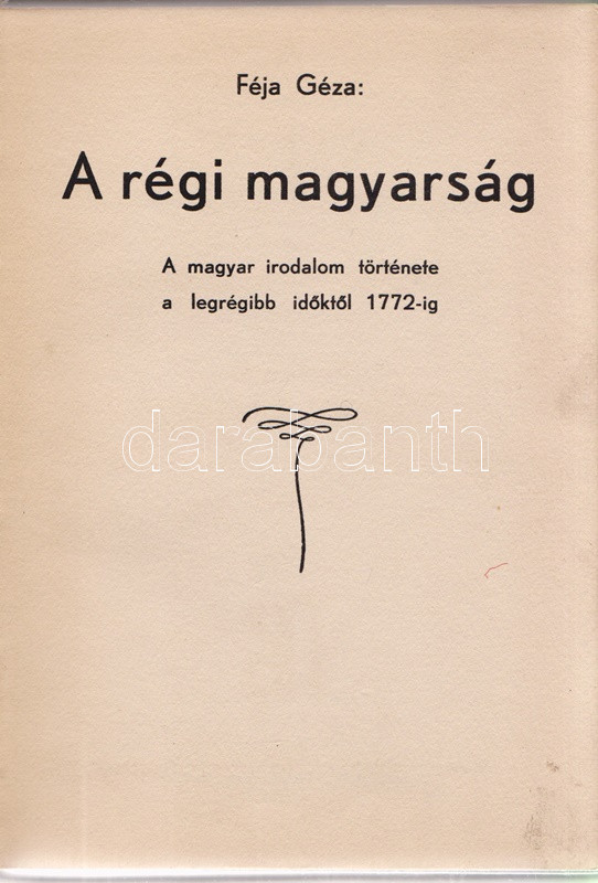Féja Géza: A régi magyarság. A magyar irodalom története a legrégibb időktől 1772-ig. (Aláírt.) Bratislava-Pozsony, [1937]. Tátra Könyv- és Lapkiadó Rt. (,,Pallas" könyvnyomda, [Eperjes] Prešov). 197 + [3] p. Első kiadás. Az első nyomtatott oldal verzóján az író saját kezű aláírása: ,,Budapest, 1941. okt. 7. Féja Géza". Az író irodalomtörténeti monográfiájának első, önmagában is megálló része. A kiadást követő években, 1941-ben megjelent a munka 2., 1943-ban a 3. kiadása, mindkettő Püski Sándor Magyar Élet Kiadója gondozásában. Feliratozott, Jánoska Tivadar által tervezett kiadói egészvászon kötésben. Jó példány.