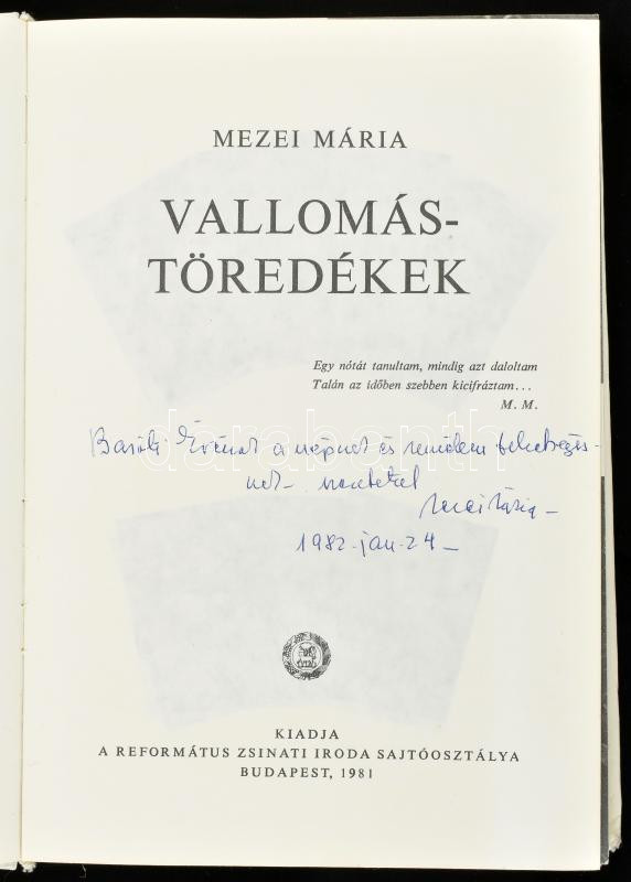 Mezei Mária: Vallomástöredékek. Bp., 1983., Református Zsinati Iroda S...