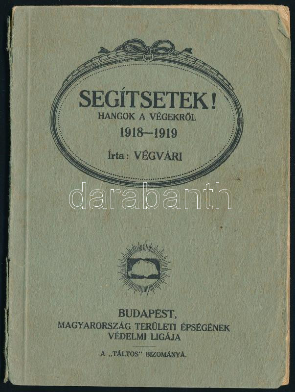 Description: [Reményik Sándor] Végvári: Segítsetek! Hangok a végekről 1918-1919. Bp., 1919, Magyarország Területi Épségének Védelmi Ligája (Hornyánszky-ny.), 63+(1) p. Első kiadás. Kiadói papírkötés, sérült borítóval, a címlapon korabeli tulajdonosi névbejegyzéssel (Dvorzsák Eliz).