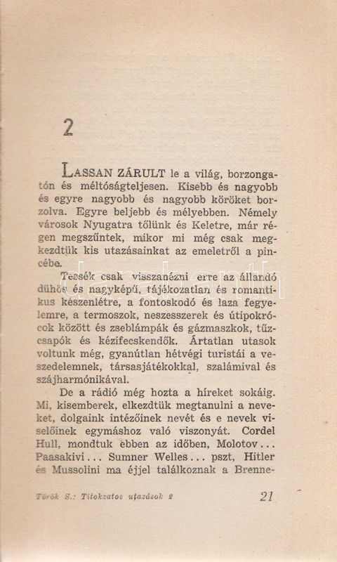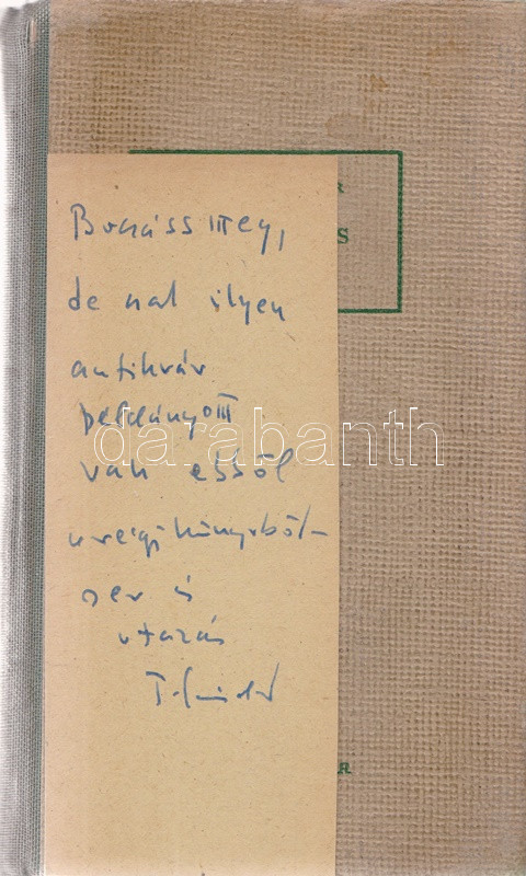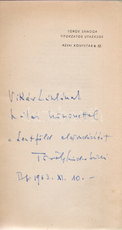Török Sándor: Titokzatos utazások. Regény. (Kétszeresen dedikált.) (Budapest, 1947). Révai Irodalmi Intézet (ny.) 159 + [1] p. Egyetlen kiadás. Dedikált: ,,Vikár Lászlónak hálás köszönettel a Szentföld elmondásáért. Török Sándor bácsi. Bp. 1963. XI. 10." A kötetben elhelyezett betétlapon kÃsérÅ‘ dedikáció: ,,Bocsáss meg, de csak ilyen antikvár példányom van ebbÅ‘l a régi könyvbÅ‘l [...] Török Sándor". Az elsÅ‘ elÅ‘zéken az ajándékozást megelÅ‘zÅ‘ idÅ‘szakból származó régi tulajdonosi bejegyzés. Példányunk fűzése kissé meglazult. Prov.: Vikár László. [Vikár László (1929-2017) zenetudós, népdalkutató, népdalgyűjtÅ‘, számos országban oktató egyetemi tanár.] (Révai könyvtár, 8. szám.) Aranyozott gerincű, enyhén sérült kiadói félvászon kötésben.