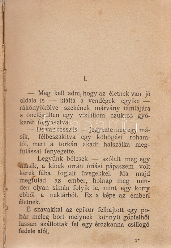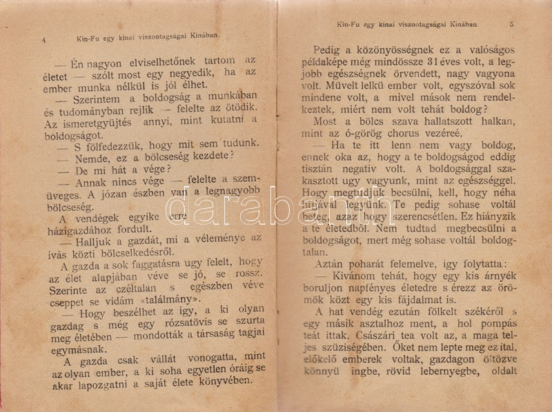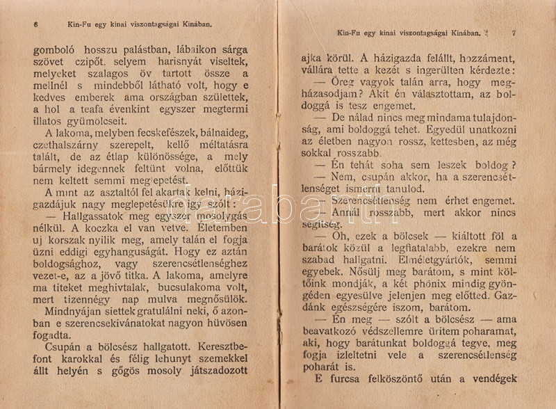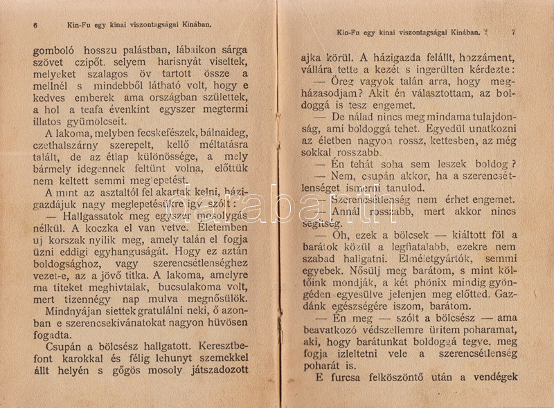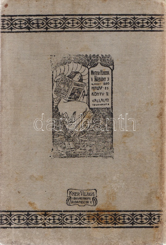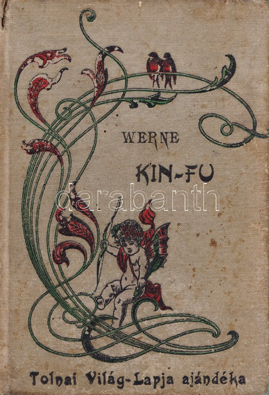 Verne, [Jules] Gyula: Kin-fu. Egy kínai viszontagságai Kínában. Budapest, 1903. Magyar Kereskedelmi Közlöny (Beer E. és társa, ezelőtt ,,Kosmos" nyomda). 160 p. Első Tolnai-kiadás. Verne Gyula kalandregénye eredeti nyelven először 1879-ben jelent meg, ,,Les tribulations d'un chinois en Chine" címmel. Első magyar fordítása Zigány Árpád fordításában a Franklin-kiadó klasszikus Verne-sorozatában jelent meg (Budapest, 1899), a fordítás 1903-tól a Tolnai Világlapja és a Magyar Kereskedelmi Közlöny kiadásában megjelent változattal, kiadványunkkal versenyzett. A címoldalon régi tulajdonosi bélyegzés. Néhány oldalon halvány foltosság, példányunk fűzése enyhén meglazult. Színes, illusztrált, enyhén sérült gerincű, enyhén foltos kiadói kötésben (Kner Vilmos könyvkötészete, Budapest), vörös festésű lapszélekkel, a gerincen és az első kötéstáblán alternatív helyesírású szerzőjelöléssel: ,,Werne".