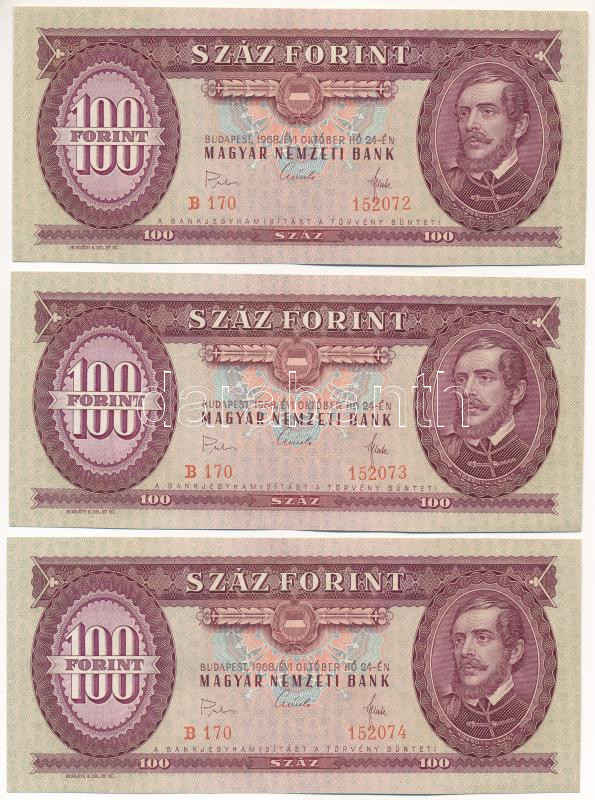1968. 100Ft (3x) sorszámkövetők "B 170 152072 - B 170 152074" nyomdai ...