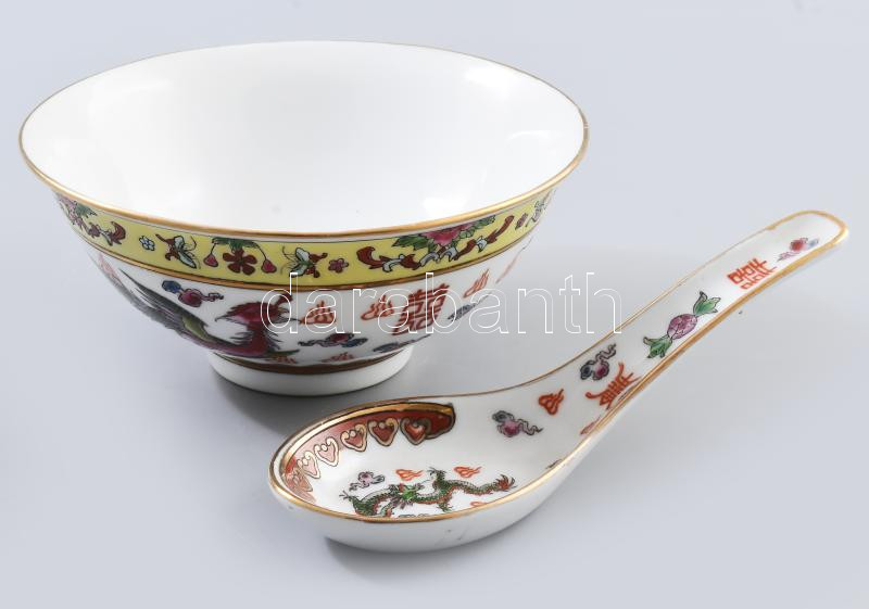 Sárkánymintás kínai leveses tál kanállal. Jelzett, hibátlan, d: 13 cm, kanál h: 14 cm