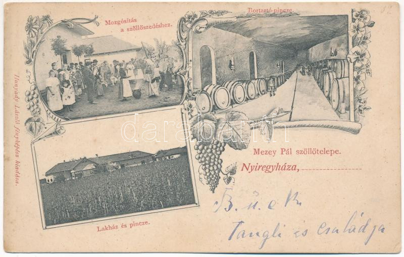 Description: 1899 (Vorläufer) Nyíregyháza, Mezey Pál szőlőtelepe, mozgósítás a szőlőszedéshez, lakház és pince, bortartó pince. Hunyady László fényképész kiadása. Art Nouveau, floral (EK)